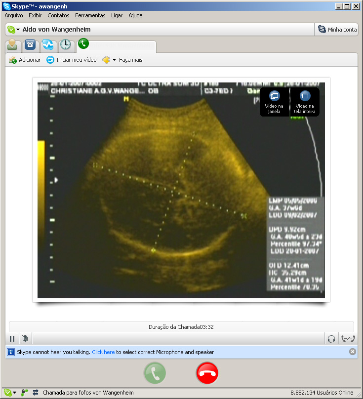 Exemplo 2: Transmissão via Skype de exame de ultrassom obstétrico a partir de um DVD com exame gravado pelo próprio software do aparelho de ultrassonografia. Aqui fizemos dois experimentos: