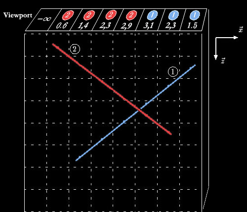 o valor ![]() O próximo passo é mapear, pixel a pixel, a profundidade de cada objeto da cena que se encontra atrás daquele pixel. Tome cada um dos polígonos, execute a conversão por varredura e, durante esta conversão, execute os passos seguintes: Passo 1 - Verificação de intersecção. Para cada pixel, determine os polígonos da cena cuja conversão de varredura resultou em um elemento com as coordenadas x,y deste pixel.Exemplo: Se inserirmos uma linha, como mostrado abaixo, nós registramos valor de profundidade de cada pixel e obtemos as valores mostrados na figura: Se inserimos uma segunda linha e aplicamos o algoritmo acima novamente, vemos que o z-Buffer foi atualizado e mostra o índice da linha "da frente", visível, naquele pixel e o valor de profundidade da linha naquele ponto. ![]() Podemos descrever na forma de um pseudocódigo bastante simples o que descrevemos acima. Algoritmo Z-Buffer Dados: