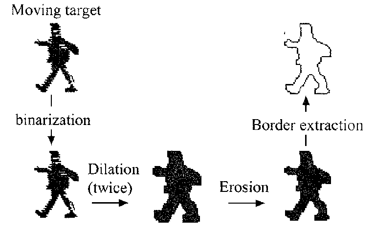 Figura 8 – Reconhecimento de gestos em tempo-real baseado em esqueletonização. Outro trabalho que também envolve vídeo em tempo-real foi realizado por Fujiyoshi e Lipton. Agora, o objetivo é analisar o movimento de um alvo humano. Para isto, quando um alvo em movimento é detectado, a sua borda é extraída (Figura 9) e o esqueleto do padrão resultante é calculado. O interessante é que o esqueleto resultante é sempre na forma de uma estrela de cinco pontas (cabeça, braços e pernas), Figura 10. Desta estrela, são determinados a postura e o movimento cíclico. Com isso, pode-se determinar atividades como correr e andar, e a andatura (modo de andar) do alvo. Devido ao uso da esqueletonização, o sistema não requer um modelo do corpo humano ou um grande número de pixels para o alvo, o que torna-o bastante barato.