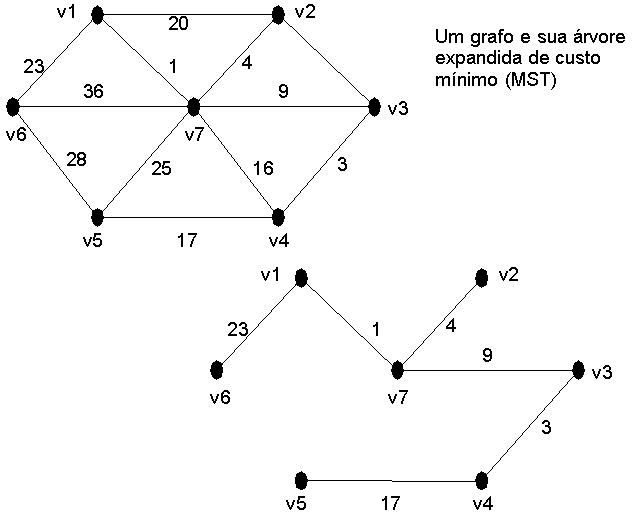 Relembrando: Dado grafo G(V, E) conexo e com uma função de custo associada a cada uma de suas arestas, uma árvore expandida de custo mínimo (MST) é uma árvore que contém todos os vértices de G e onde a soma dos custos das arestas é mínimo. Um grafo pode ter mais de uma árvore expandida de custo mínimo.