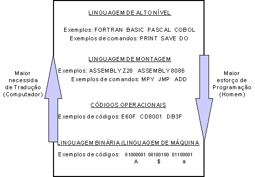 A Figura I-7 resume o que foi dito acima. Note que quanto mais próximo se chega da linguagem humana corrente - e este é um dos objetivos mais perseguidos pela pesquisa em informática - mais trabalho terá o computador para levar os termos destas linguagens para zeros e uns. Os computadores vão ficando cada vez mais "felizes" à medida que se escreve programas em linguagens de níveis mais baixos. Se recebem programas em linguagem binária, eles ficam entusiasmados e como não precisam traduzir nenhum código, trabalham muito mais rapidamente, "em agradecimento".
