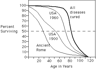 Such a future cannot be realized through biology. In recent times we've learned a lot about health and how to maintain it. We have devised thousands of specific treatments for particular diseases and disabilities. However, we do not seem to have increased the maximum length of our life span. Franklin lived for 84 years and, except in popular legends and myths, no one has ever lived twice that long. According to the estimates of Roy Walford, professor of pathology at UCLA Medical School, the average human life span was about 22 years in ancient Rome; about 50 in the developed countries in 1900, and today stands at about 75. Still, each of those curves seems to terminate sharply near 115 years. Centuries of improvements in health care have had no effect on that maximum.